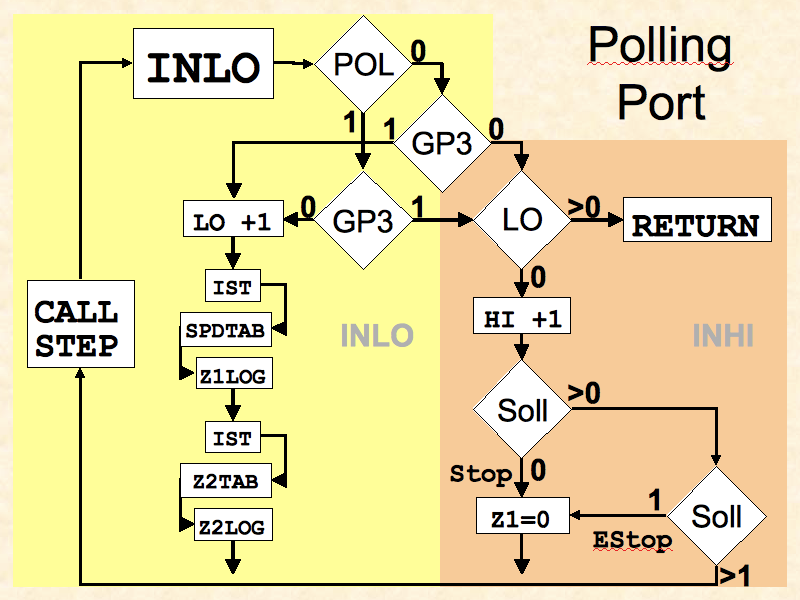 Full bit detection. Poll input port every 44µs, count up LO and HI counter. Exchange speedtables and set counter Z1 to zero if stop or estop detect.